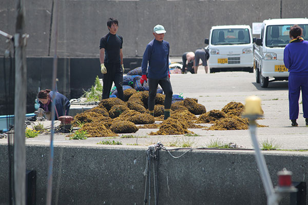4月5月の大潮の干潮時に、国崎の海女さんや漁師さん達が総出で磯に生えた『ヒジキ』を手作業で刈り取って行きます。そして、